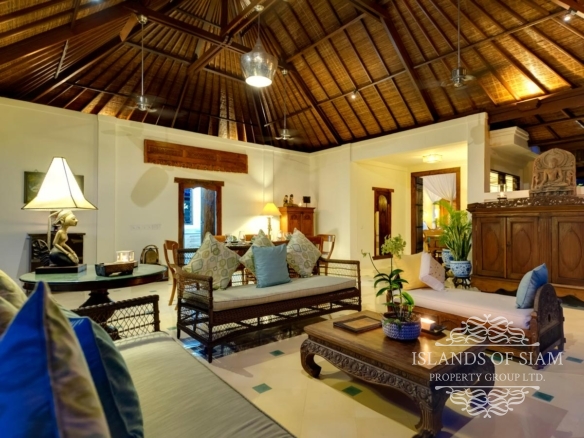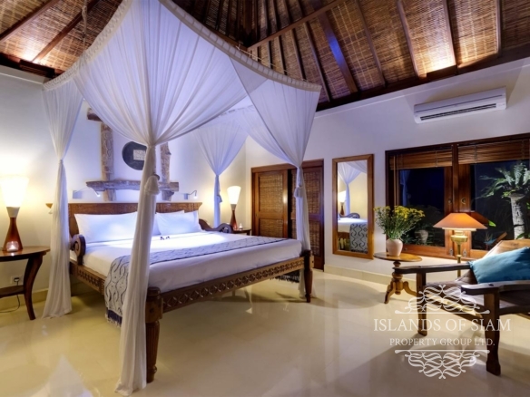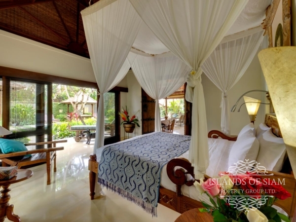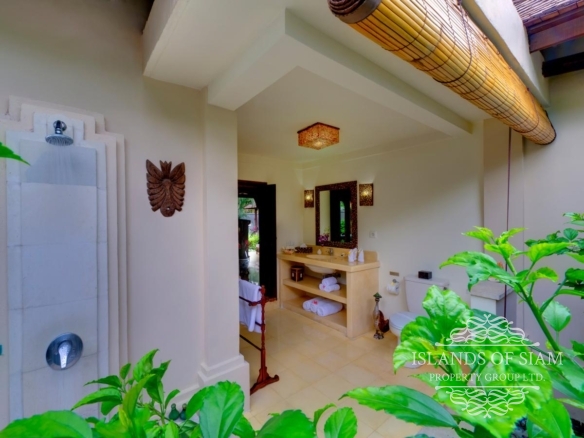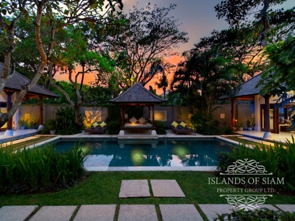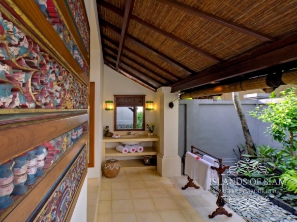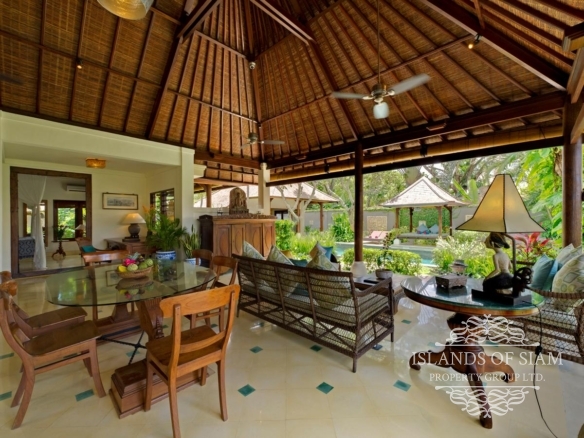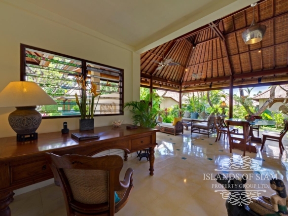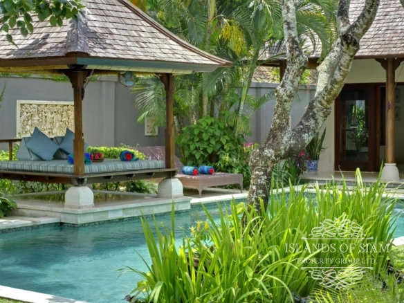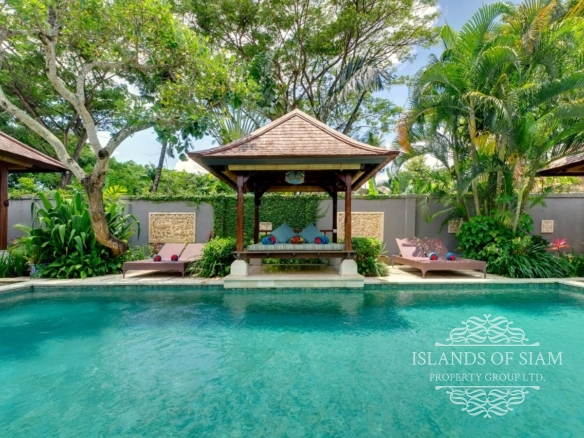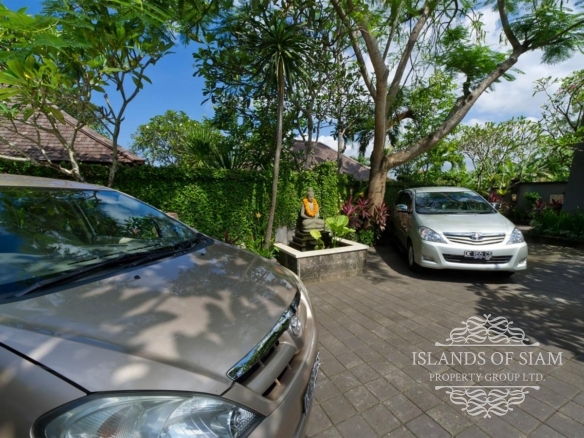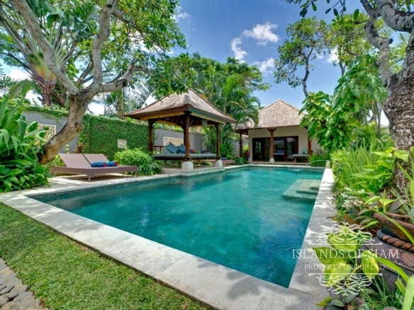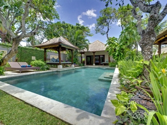 Situated inside a private walled garden, this cute and compact haven is the quintessential Balinese home with solid coconut beams supporting high serapwood ceilings that capture the tropical breeze and cool the open-sided living spaces. An enticing natural greenstone swimming pool sits central to the property, offering easy access from the surrounding bedrooms that all feature beautifully carved wooden beds and semi-open garden bathrooms.