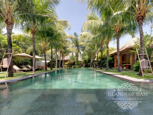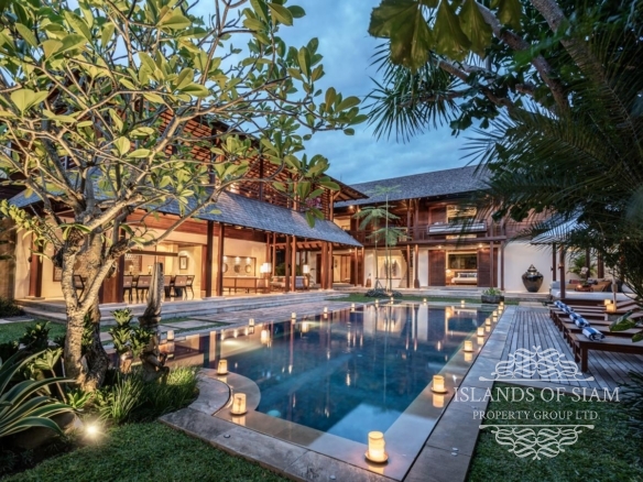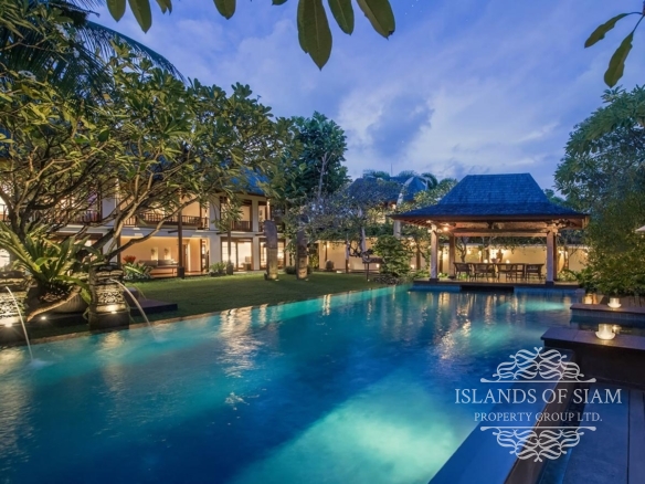 Four luxurious pavilions arranged around a generous 14-metre swimming pool combine to create one stunning residence. The two-level sleeping pavilion has a wide balcony with views over the pool that glows neon blue at night. Lush landscaped gardens fringe each pavilion and provide a setting for alfresco dining. A full kitchen and casual dining space are housed in another pavilion while a formal dining area adjoins plush living spaces that are decorated with graceful furnishings and modern facilities in a grand central pavilion.