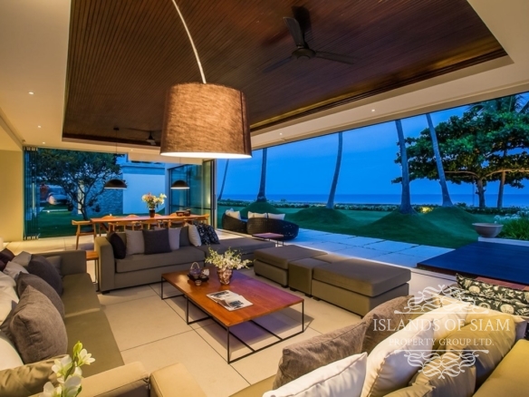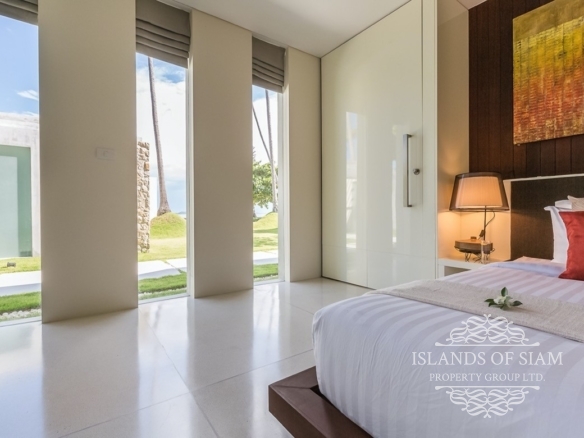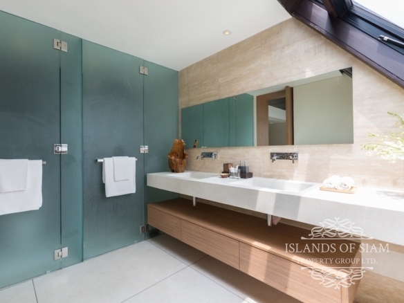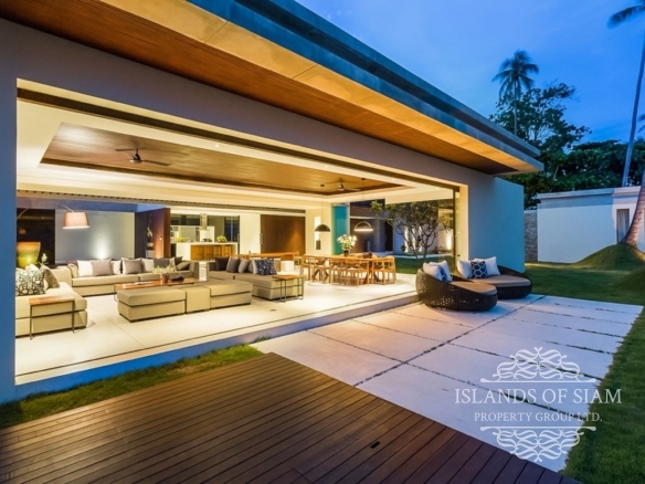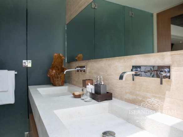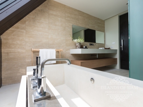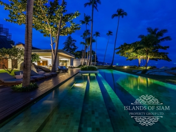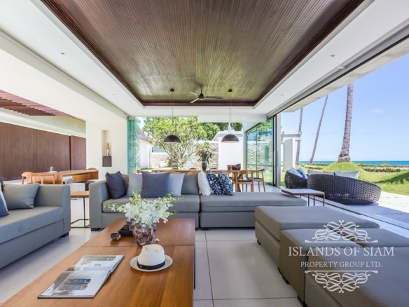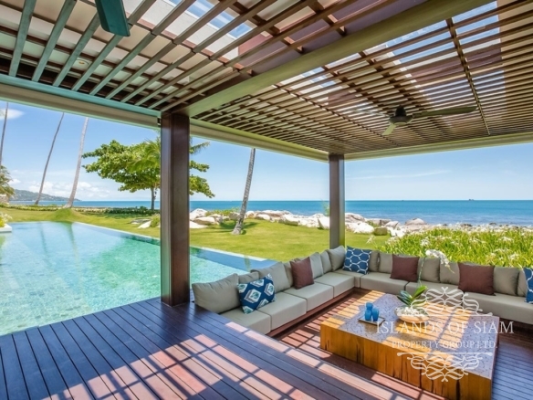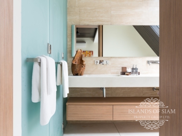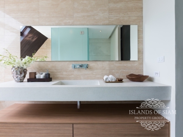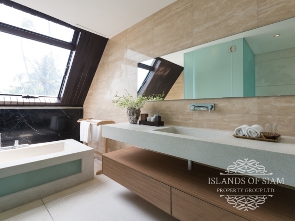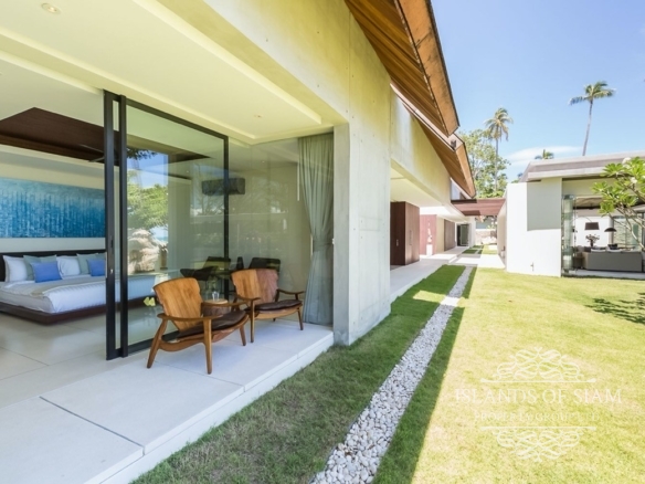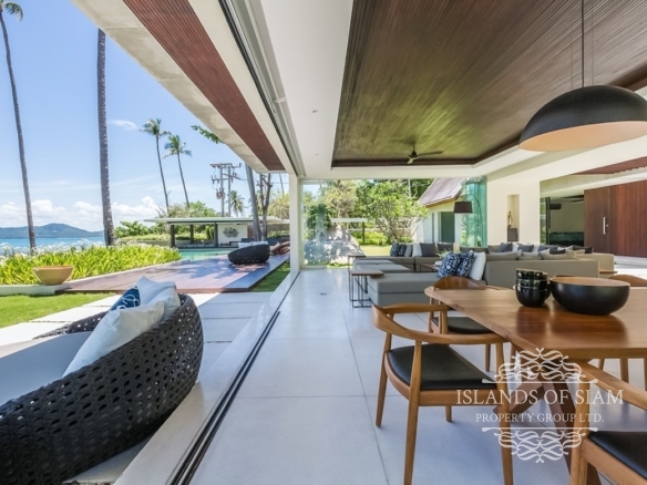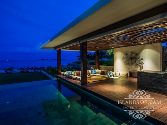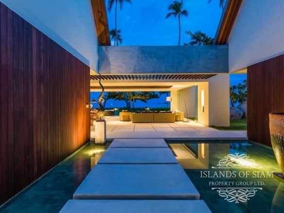 The luxurious, modern 5-bedroom Villa Malabar plus 2 kids’ bedrooms is located next to the Golden Pagoda on Laem Sor Beach, on the quiet, picturesque south coast of Samui. This beachfront villa’s design epitomises indoor-outdoor living, with living spaces opening up completely to the gorgeous surroundings, and making the most of the sea breeze.  Malabar’s design reflects its beautiful natural surroundings, by using elements and finishes that blend in, rather than stand out. The use of materials such as stone, wood, polished concrete, sandblasted glass, travertine and terrazzo, as well as fabrics in neutral shades with splashes of colour for accent, means that the view and environment are cleverly highlighted, rather than compromised.