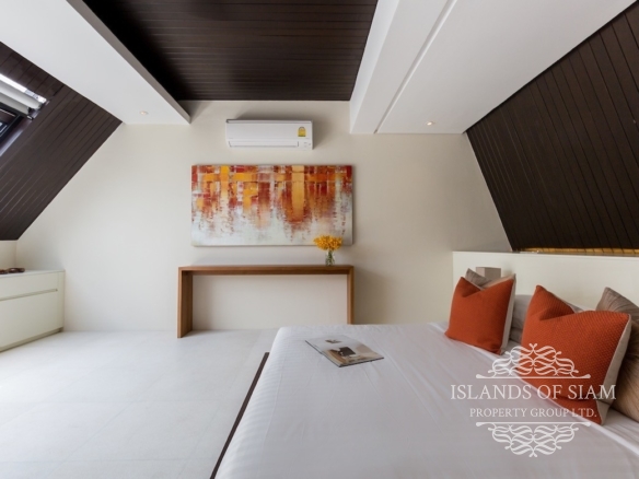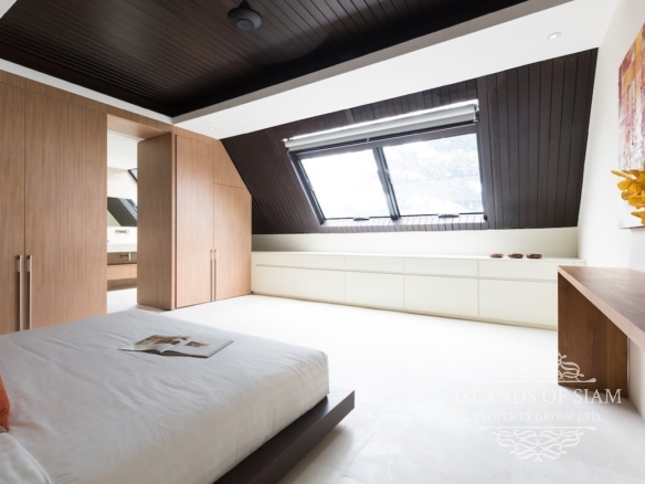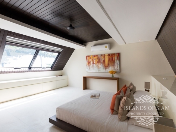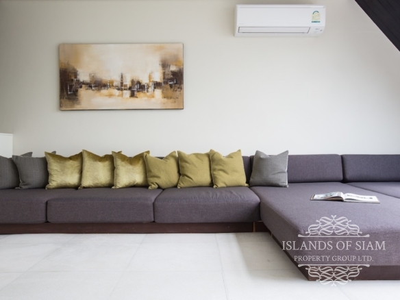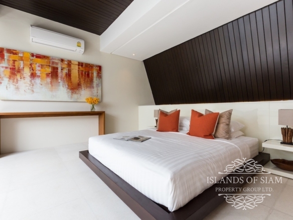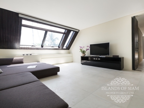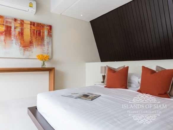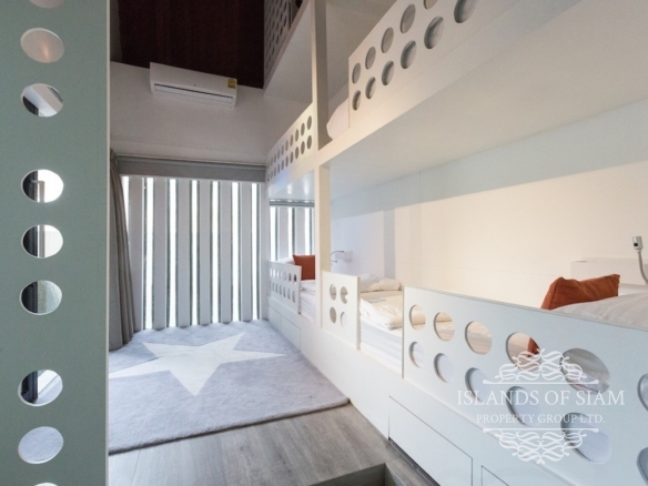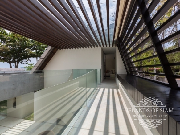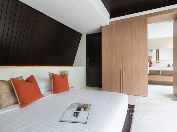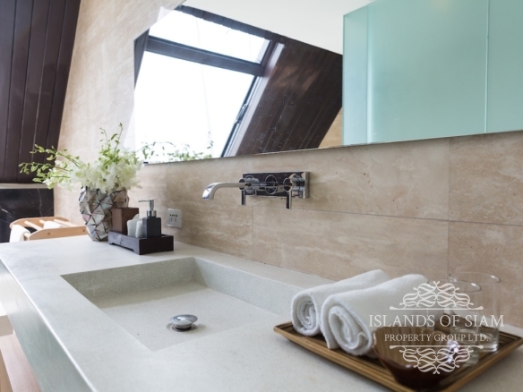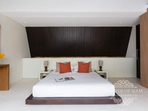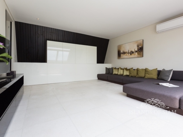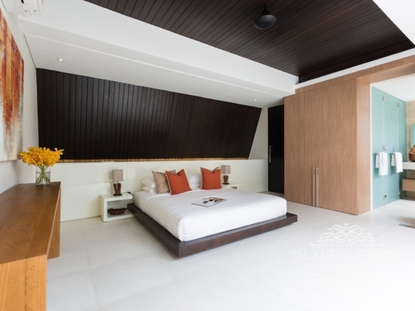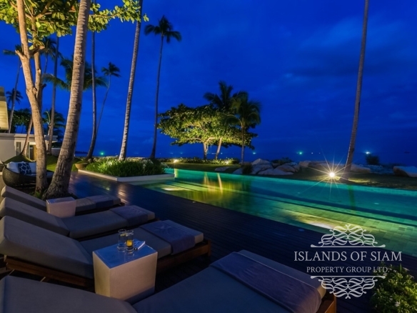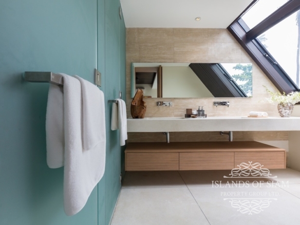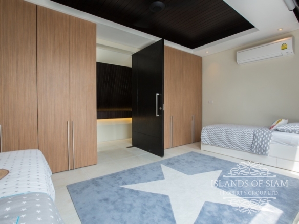 The luxurious, modern 5-bedroom Villa Malabar plus 2 kids’ bedrooms is located next to the Golden Pagoda on Laem Sor Beach, on the quiet, picturesque south coast of Samui. This beachfront villa’s design epitomises indoor-outdoor living, with living spaces opening up completely to the gorgeous surroundings, and making the most of the sea breeze.  Malabar’s design reflects its beautiful natural surroundings, by using elements and finishes that blend in, rather than stand out. The use of materials such as stone, wood, polished concrete, sandblasted glass, travertine and terrazzo, as well as fabrics in neutral shades with splashes of colour for accent, means that the view and environment are cleverly highlighted, rather than compromised.