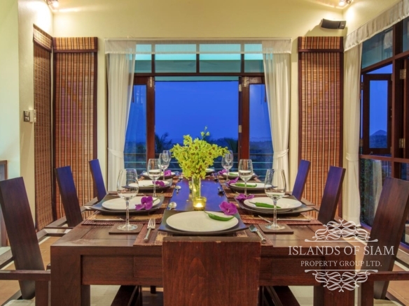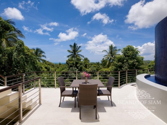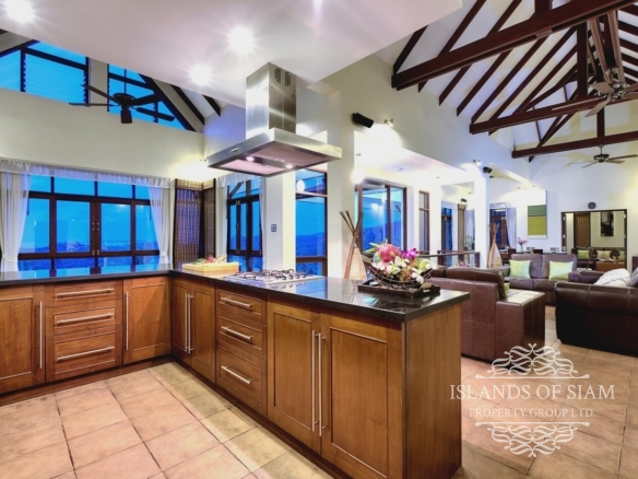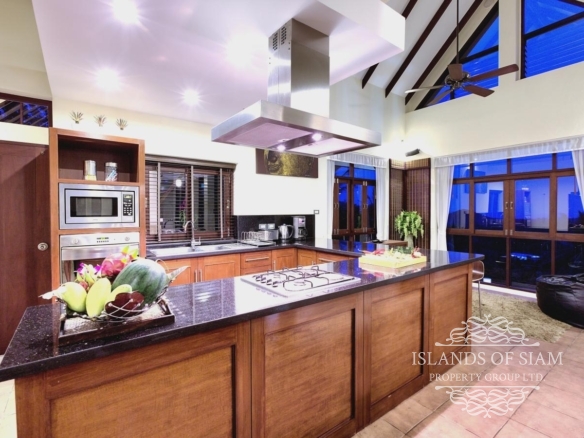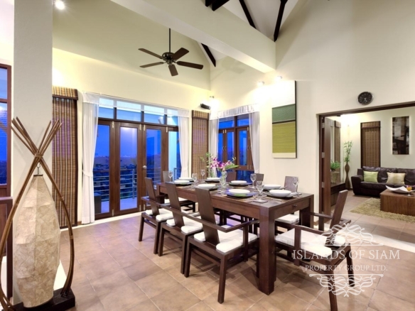 The entrance level of the villa, with its vaulted ceilings is the perfect blend of modern luxury and tropical elegance. Comfortable and inviting here you will find a fully functional, open plan, western kitchen with stylish black granite work surfaces, elegant wooden cupboards and all of the amenities you would expect to find in a villa of this standard. Beyond the kitchen is a spacious open plan living area that affords spectacular views of the tropical rain forest, the ocean and Koh Phangan beyond that can be appreciated whilst relaxing in one of the sumptuous and comfortable sofas. The open plan dining area also offers guests the privilege of soaking up incredible views while dining. The elegant hard wooden dining table can comfortably seat up to eight diners and the outdoor ocean view dining terrace is the perfect place to relax with a cocktail and marvel at the sunset. Beyond the dining area is a comfortable and private living area can be found with comfortable seating, a state of the art entertainment system and panoramic ocean views. From here one can sit back and relax and feel the stresses of modern life dissolve.