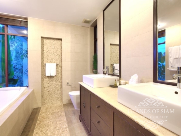 From the entrance level an attractive staircase leads down to the second level that has three en-suite bedrooms. The master suite has been tastefully furnished and has an indulgently comfortable king sized bed, a spacious dressing area and access to the pool terrace. The opulent en-suite has twin sinks, a refreshing rain shower and a luxurious bath tub. The second sumptuously furnished bedroom on the opposite side of the villa has a large comfortable bed, an en-suite with rain shower and pool terrace. Bedroom three is to the rear of this level and boats a large dressing area, king-sized bed and a luxurious bathroom with twin sinks, a rain shower and a bath tub.
