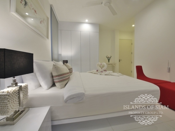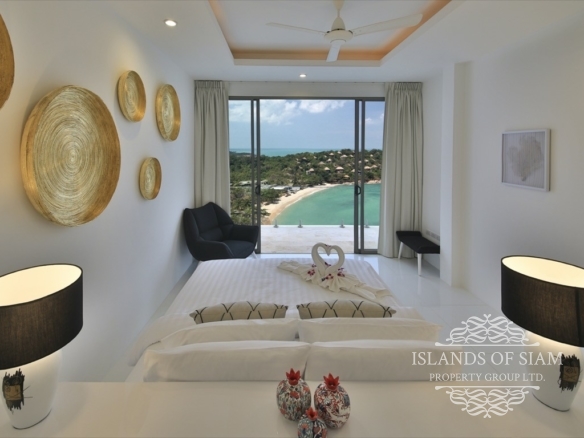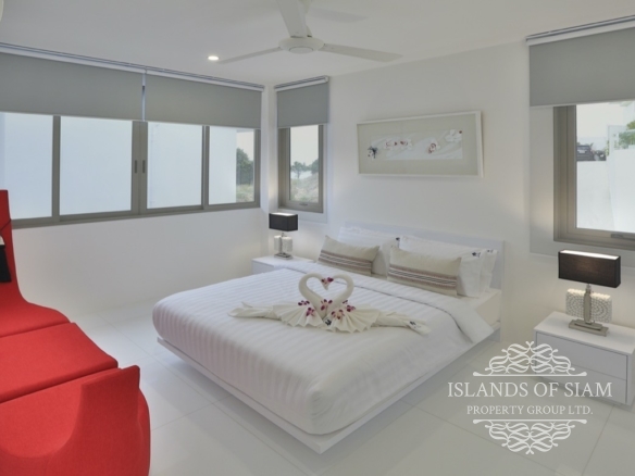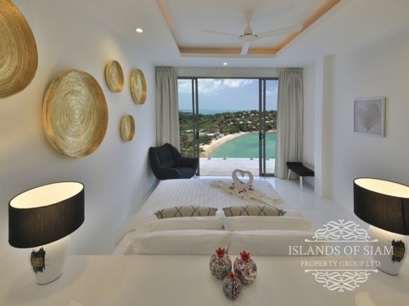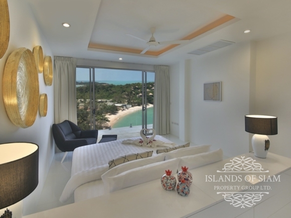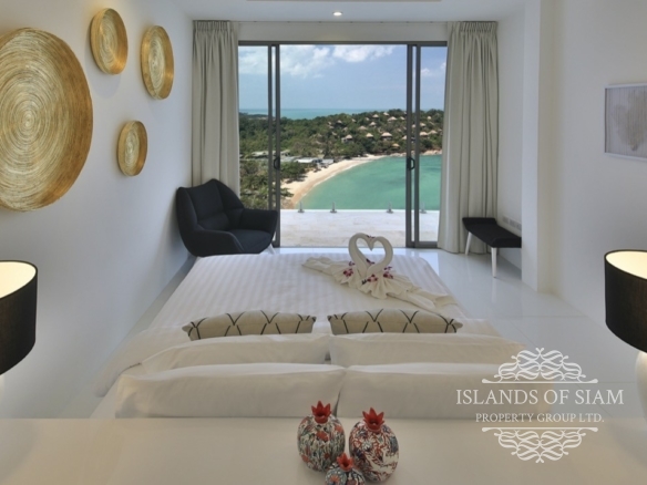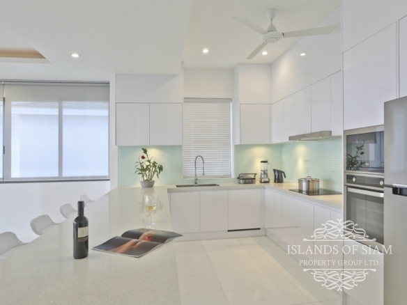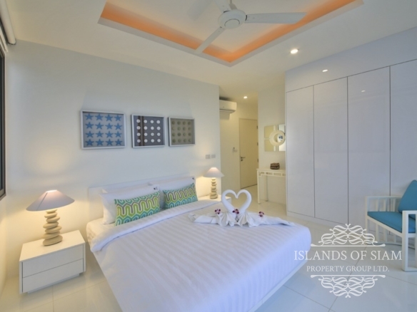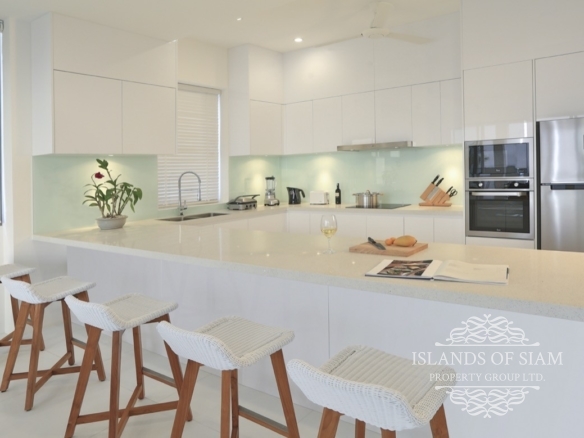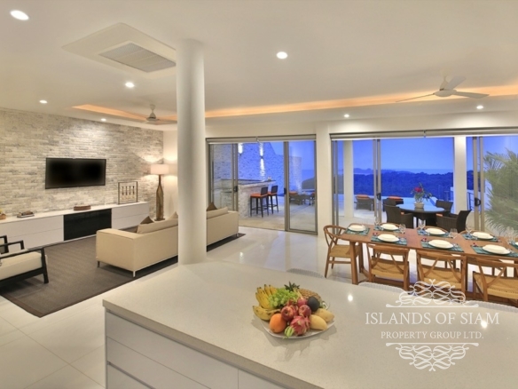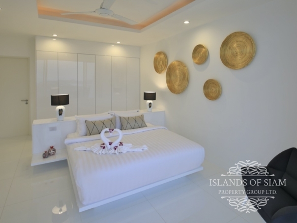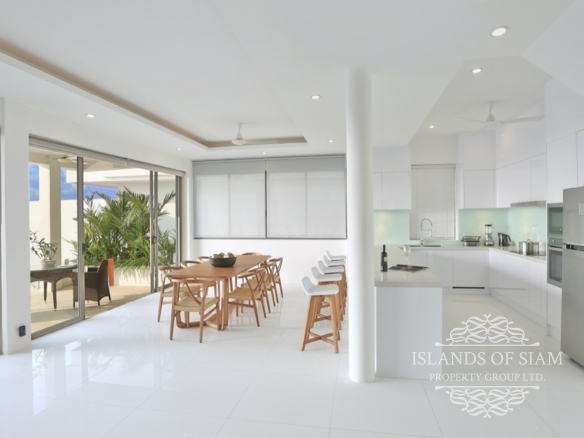 The villa’s large patio beside the 9 metre by 4 metre private pool overlooks the sandy shoreline of Tong Son Bay. And to your left you’ll start to take in the several kilometre long Big Buddha beach which stretches along the village of Bangrak and on to the well-renowned Fisherman’s Village and its myriad of restaurants, cafes, bars, market stalls and shops. Around the patio you’ll also see a pool-bar, a gas BBQ, blue-tooth speakers for the sound system, sun-beds, pool-side furniture, a remote-controlled awning and an outdoor shower.