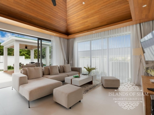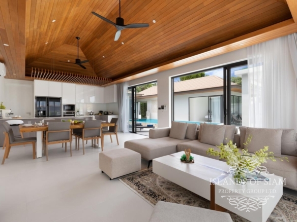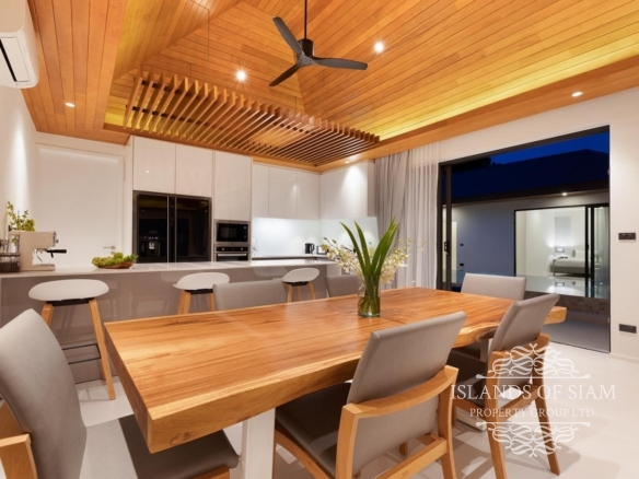 The villa consists of 3 separate pavilions which are arranged in a Balinese style around an 8m swimming pool. One pavilion contains a large open plan living area, featuring an elegant timber ceiling, and includes a European style kitchen with a pantry room and washing machine. The kitchen is fully equipped with a dishwasher, oven, and a 4-ring electric stove. There is a 55 inch Smart TV in the lounge area.