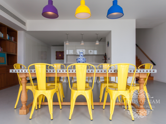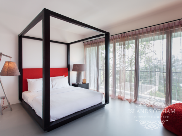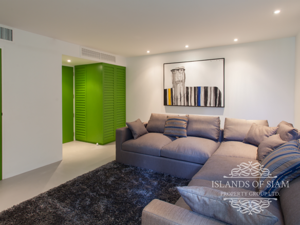All rooms at the villa open to wide views out over the treetops and beyond to the Andaman Sea and there is plenty of outdoor space around the pool for fun and relaxation. The central living and dining area is fronted by a wall of glass panels that fold back to reveal a furnished deck, 9-metre infinity pool and shaded poolside sala with its cushioned comfort. Inside, the funky eight-seater dining table and a sleek modern kitchen with breakfast bar lie at one end of the room and a comfortable leather suite and coffee table at the other. This room – in common with all others at the villa – is decorated with bright modern artwork, adding splashes of colour to the fresh white interiors. Woodwork and bathroom fittings also come in vibrant hues, creating a fun, relaxed ambiance throughout the villa. Behind the living area is a media room equipped with a flat-screen TV and furnished with a deep L-shaped sofa, which can be converted into a bed if extra space is needed. A guest washroom can be accessed from here.