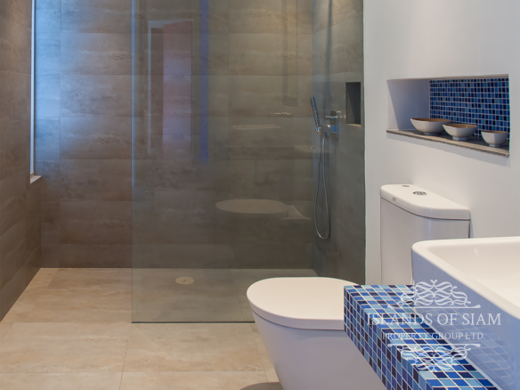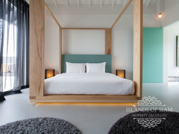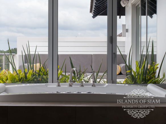 A romantic master suite occupies the entire upper floor of Villa Sammasan, furnished with a king-size modern four-poster bed and stylish chaise lounge. Lay back in the sea view jacuzzi and allow yourself to take a moment. Two similarly sized guest bedrooms (one furnished with a queen-size bed, the other with twins plus a roll-away bed) are tucked below the pool on the villa’s lower level, each with an ensuite bathroom and floor-to-ceiling windows opening onto small balconies.