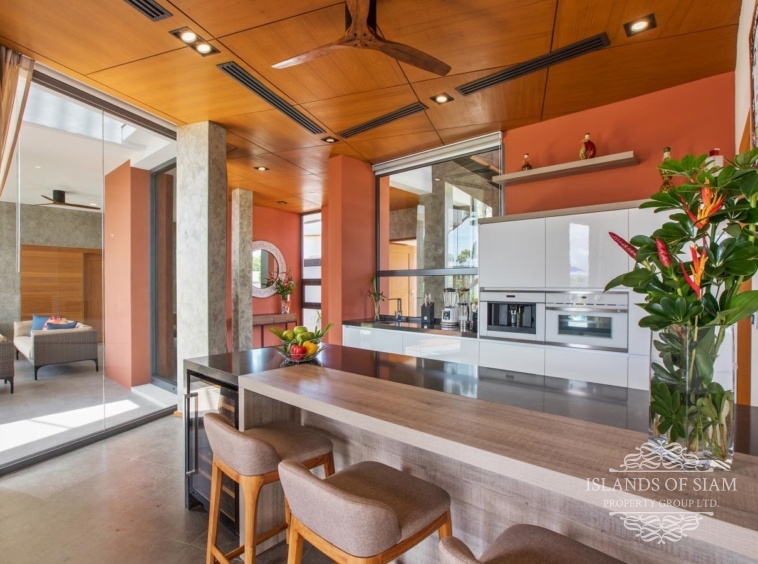 Villa Sea Senses is a beautiful four bedroom, two-level villa in the north east of Samui and commands superb views from its enviable location on the west side and northern east most tip of the beautiful Plai Laem peninsula. You know this is a good location when your neighbors include the top rated hideaway resort, Six Senses Samui – one of Samui’s finest and Ritz Carlton Samui. It is nestled into a small subdivision of quality villas and apartments. Its impressive glass walls on the west and south faces give absolute full panoramic views of Bangrak Beach and Bay and beyond to Bophut Beach and the Gulf of Thailand. The villa is just 5-10 minutes to Bangrak, Fisherman’s Village and Choeng Mon Beach Village and only 15-20 minutes to Chaweng Beach – Samui’s main commercial, entertainment and tourist centre.