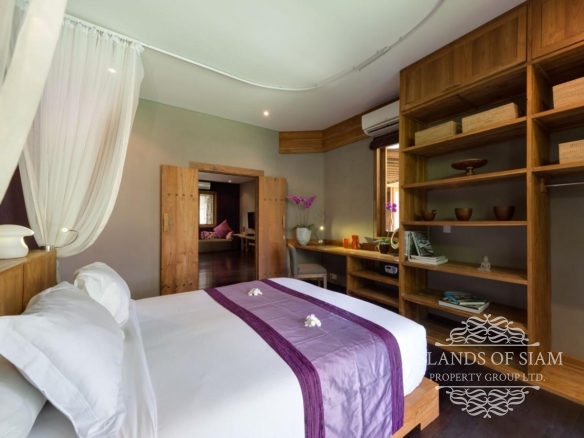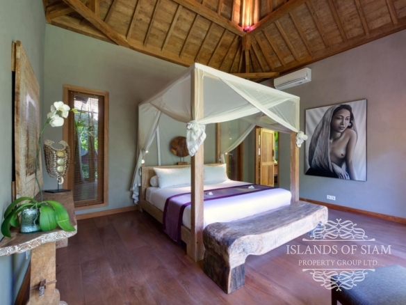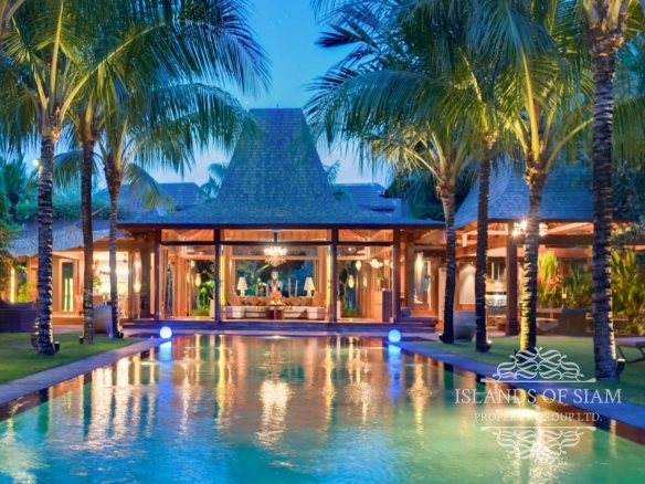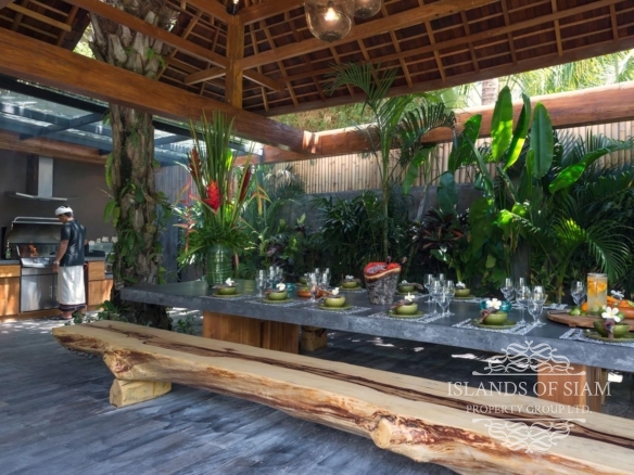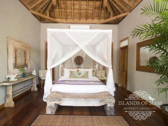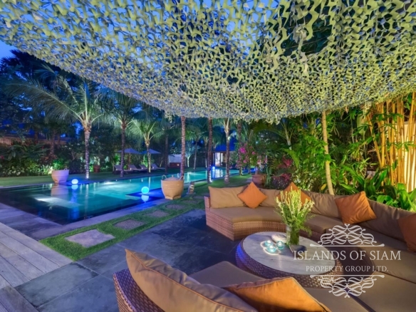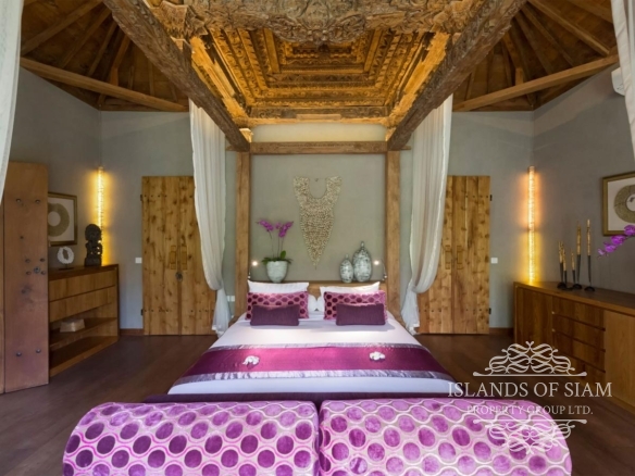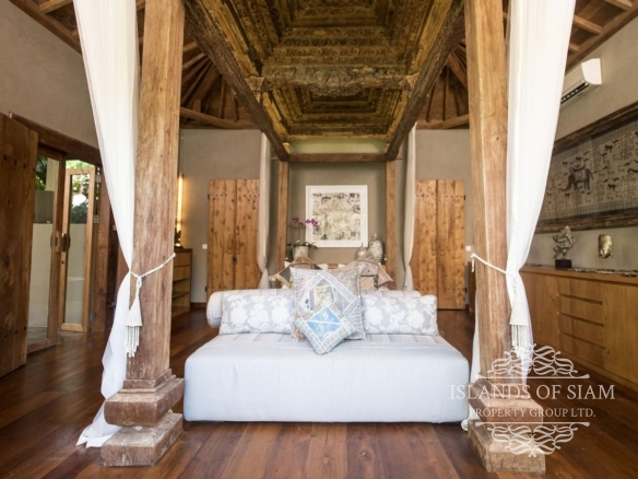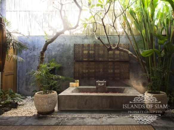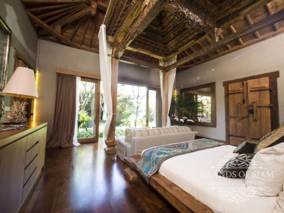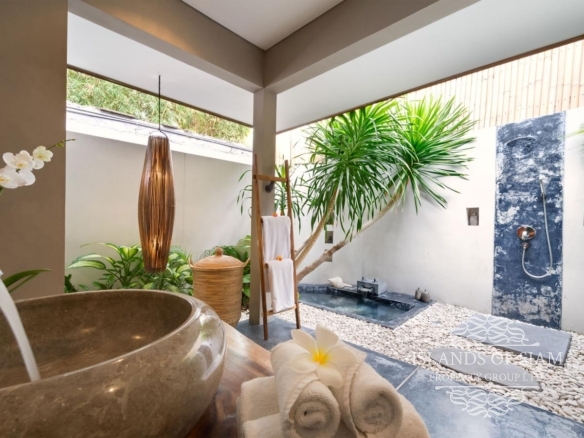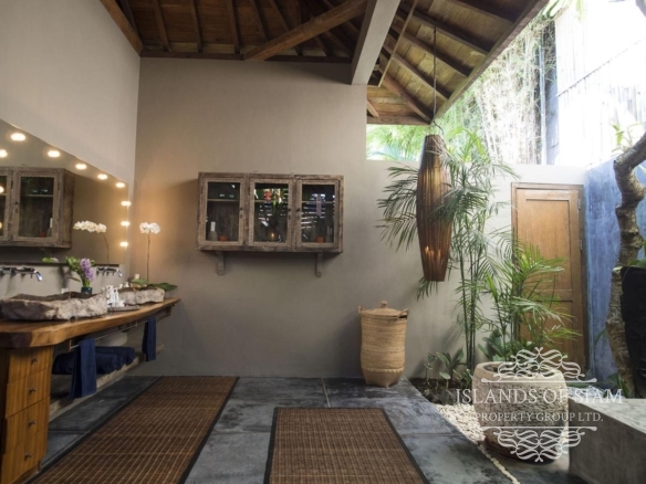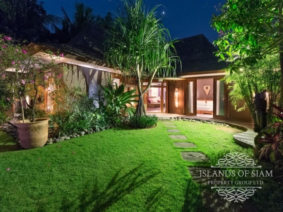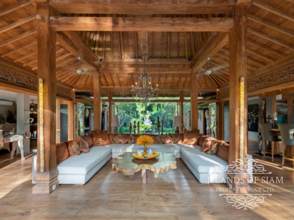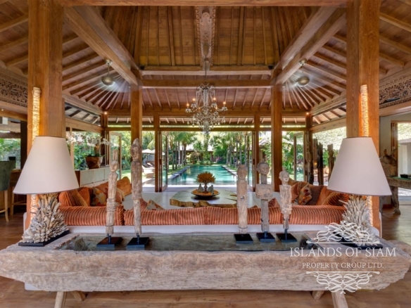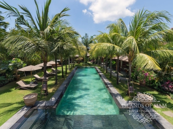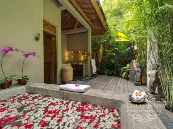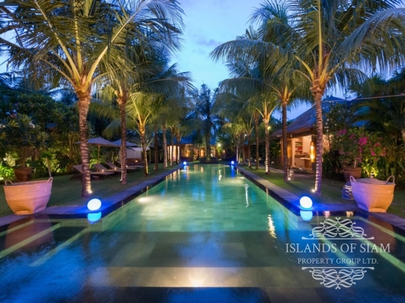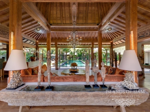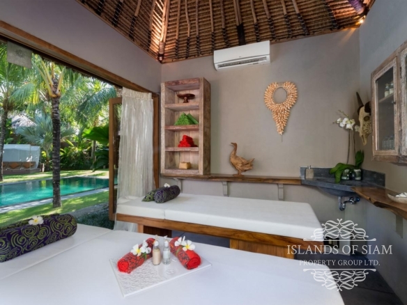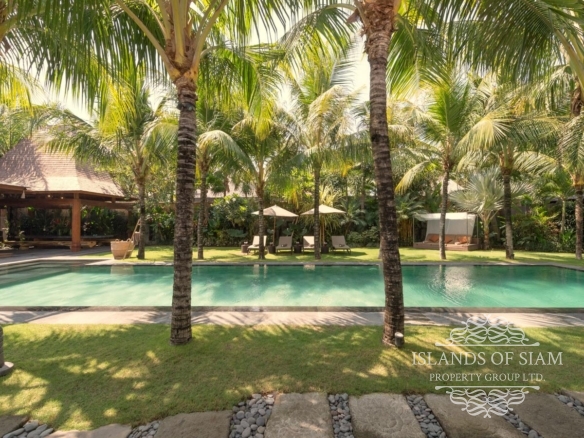 The single story property includes a main building with two bedrooms, and a separate guest house with three bedrooms, set at either end of a majestic 20m swimming pool lined with stately palms and manicured lawns. A poolside spa pavilion sets the scene for traditional massage, and specialised Ayurvedic treatments by skilled therapists. Stone statues, tropical foliage and atmospheric garden bathrooms throughout the villa further evoke the spirit of the enchanted isles of Indonesia.