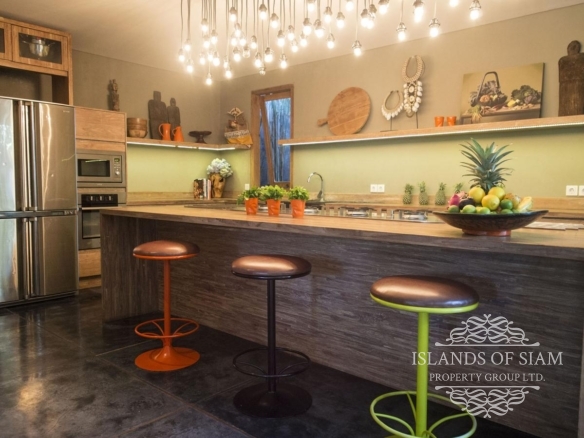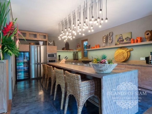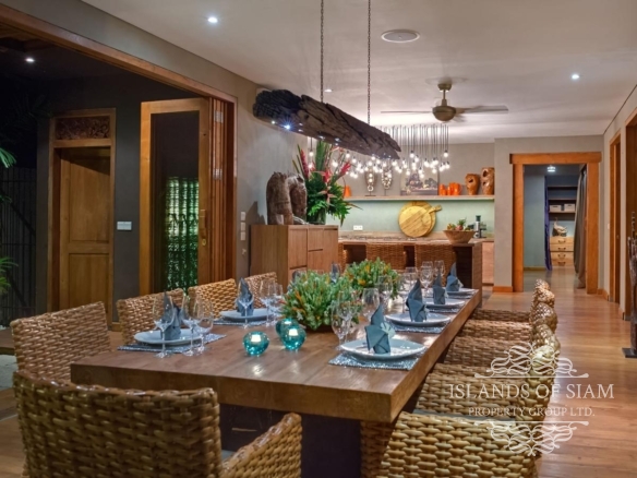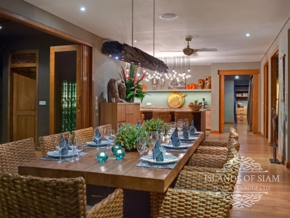A stunning, customised kitchen makes a convivial gathering place, with a cutting edge design incorporating an extensive breakfast counter, stylish fittings and every imaginable gadget one could possibly need to cook up a banquet of the highest order. However, with a talented in-house cook most guests are content to be spoiled with gourmet meals prepared from an enticing suggestion menu. Equally, a full contingent of housekeepers, waiting staff, gardeners and security staff provide a welcoming, efficient and unobtrusive service.