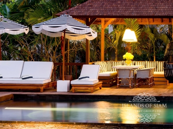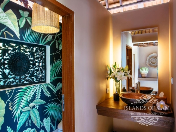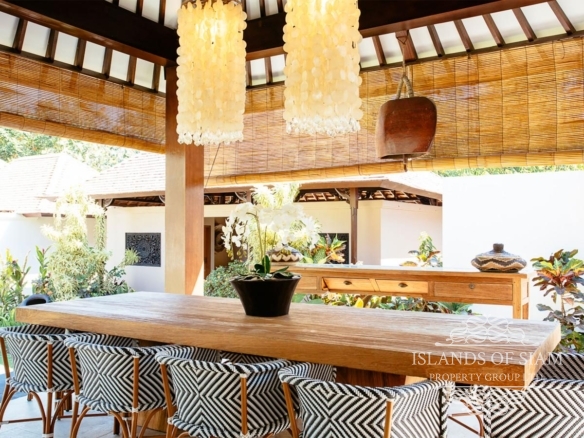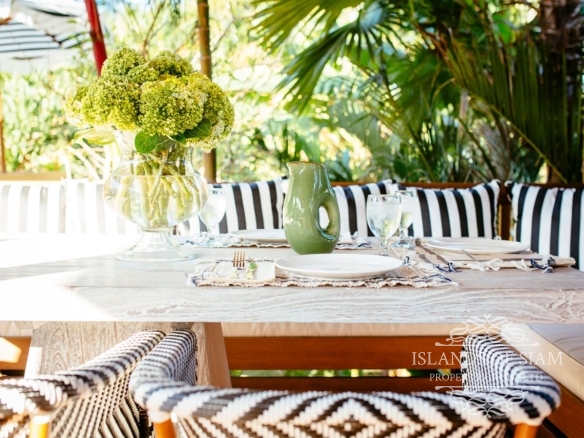 Interior designer, Elaina Myers, of 4 Corners International Design Concepts, has created a cool and contemporary villa that is perfect for extended families, larger groups or wedding parties. A sparkling 13-metre pool surrounded by wooden decking is home to a brunch-ready wooden balé with generous seating and two fabulous black bamboo-swinging chairs.