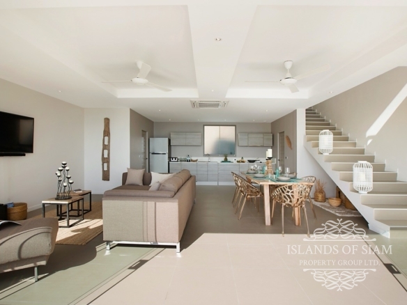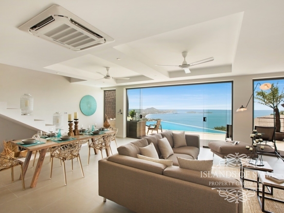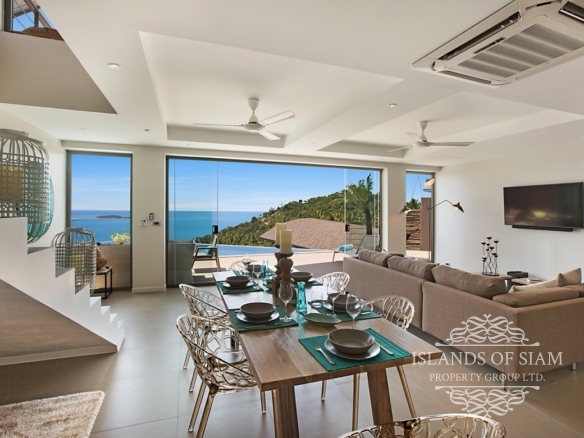Indoors there is a large air-conditioned, open-plan living room, dining room, downstairs bathroom and modern kitchen. And no matter where you sit inside, the picture perfect view of the ocean is always there as the villa has floor-to-ceiling glass doors.