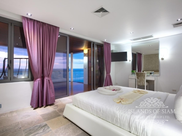 Back on the ground floor, situated to the left of the villa is a stand alone king sized en-suite bedroom that has been stylishly furnished, en-suite with satellite TV. From here you can enjoy jaw dropping ocean views thanks to the custom designed doors that open up to a central covered walkway.