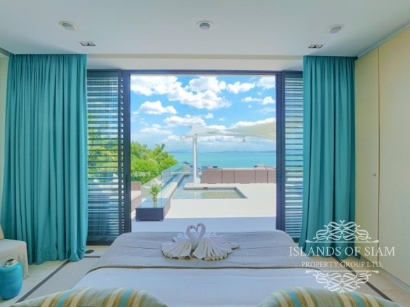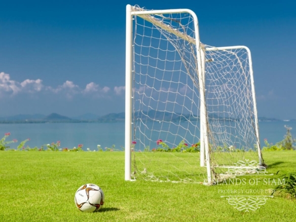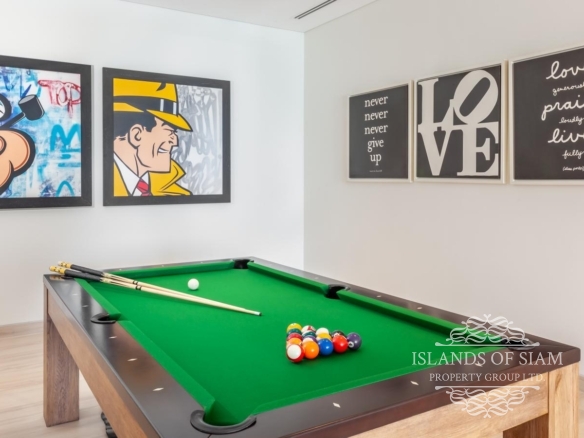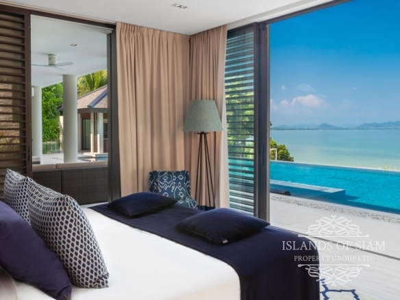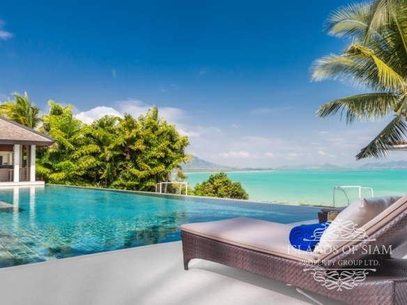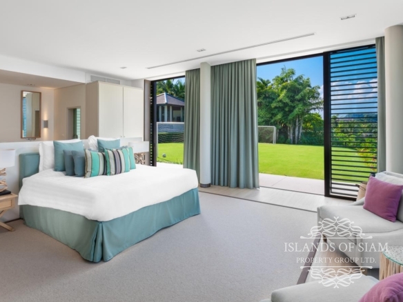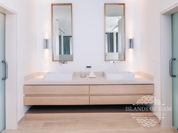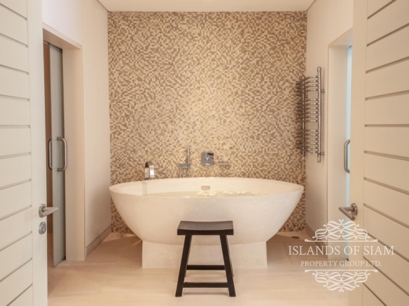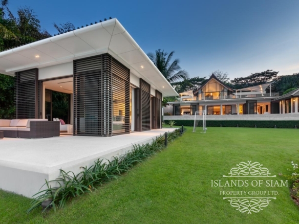 property is slowly unveiled by the light of the dawning sun. The villa has a total of 5 bedrooms, each having its own ensuite bathroom. One of the rooms is constructed as a separate bungalow just a few meters from the main house and offers an even closer view of the bay. A 25m-long infinity pool spreads across almost the property’s entire width, and a garden stretches all the way to the beach end of the estate. The villa also features an outdoor dining area and sala, a poolside bar, a Jacuzzi, a football net, kayaks, and an entertainment room with a pool table, Xbox, board games, and Apple TV.
