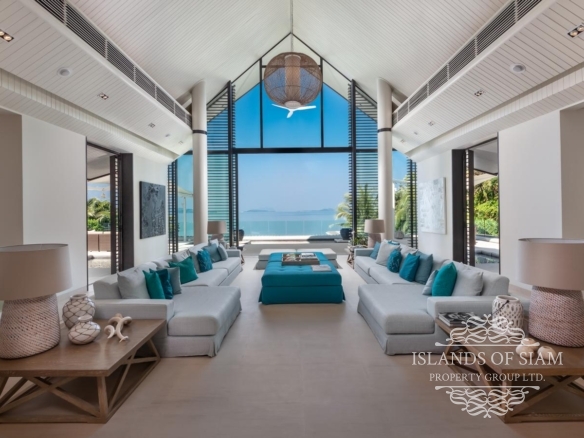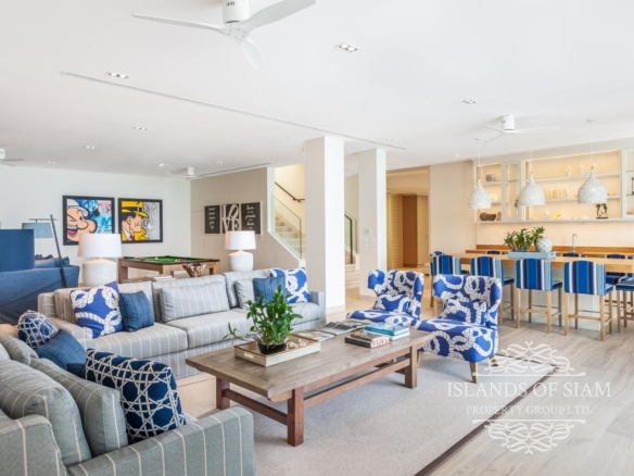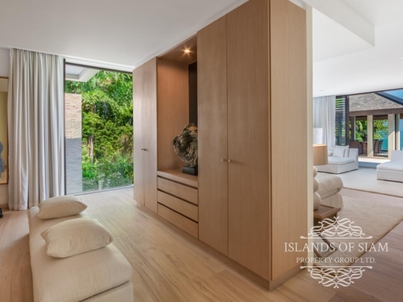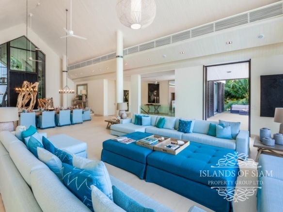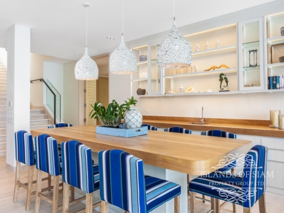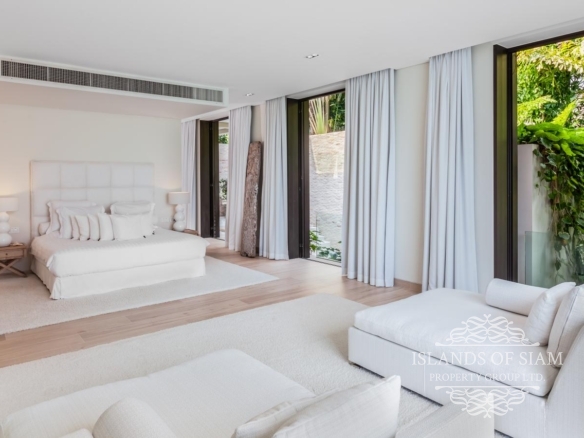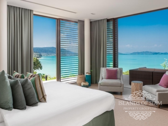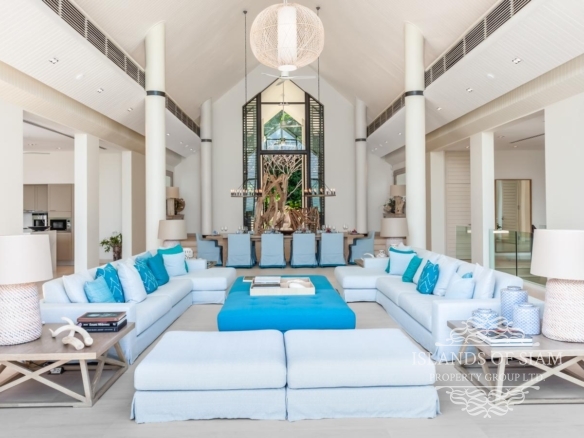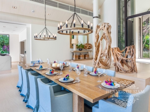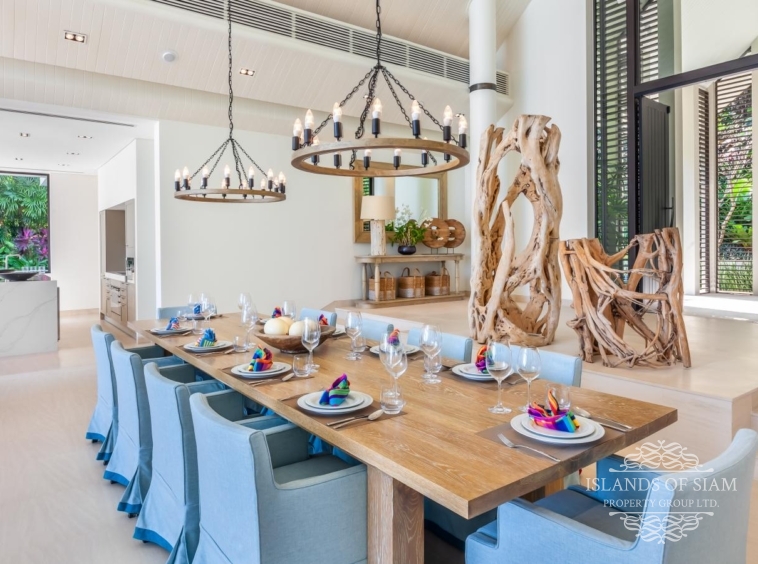 Villa Vikasa is a 5-bedroom luxury villa on Phuket’s Eastern coast. It is built on 4,865 sqm of beachfront land, overlooking Phang Nga Bay and the Andaman Sea beyond. From the property’s entrance, a series of stone steps cutting through a lush tropical garden leads you to the villa’s main doors. Upon entering the building, you are immediately greeted by the view of Phang Nga Bay, perfectly framed by the hall’s pentagonal profile. You will find a lovely dining table and a living area, generously furnished with soft, comfortable sofas. The clean, minimalist design and the light, breezy colors of the place create a warm, inviting atmosphere that will instantly wrap you. The impressive vaulted ceiling gives extra vertical space to the interior, and the chandeliers that hang from it adds a stylish touch to the room.