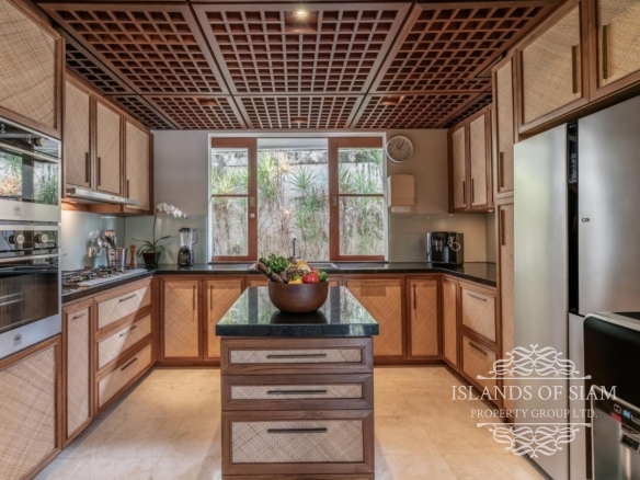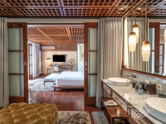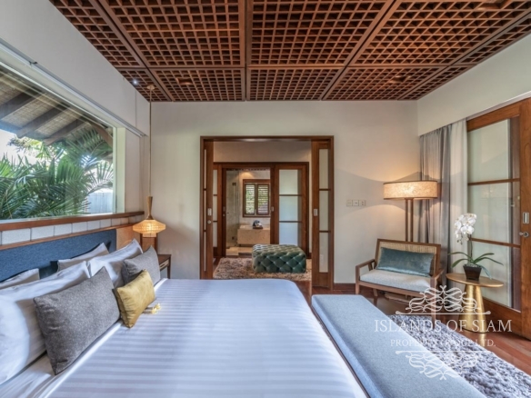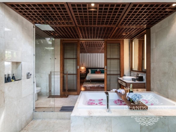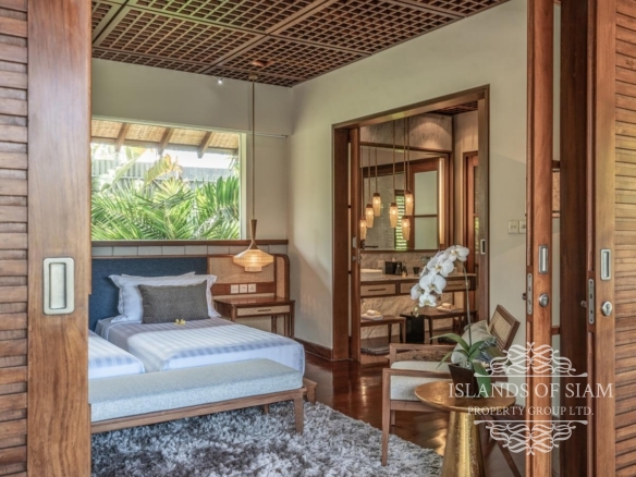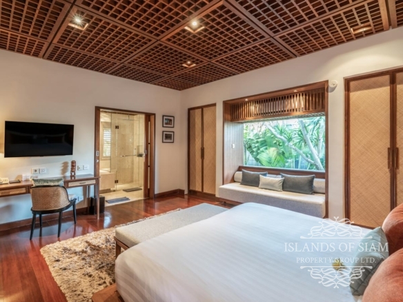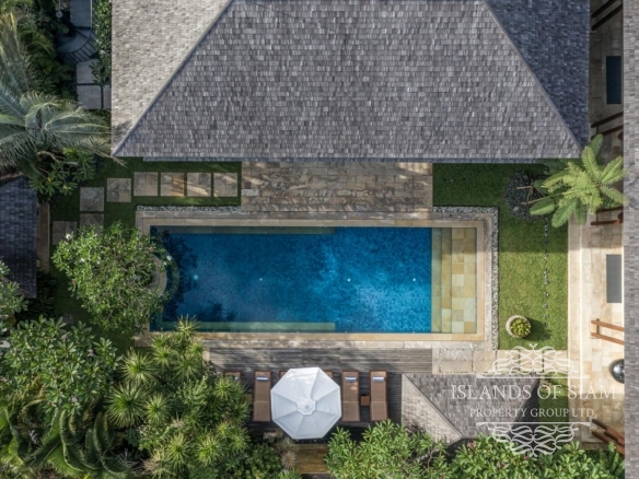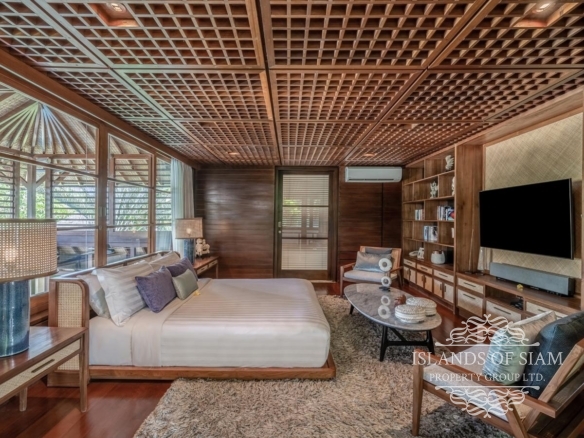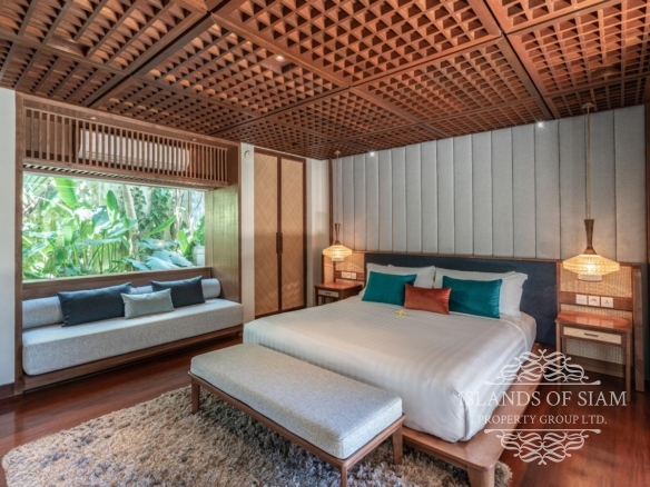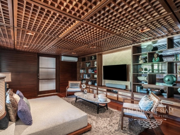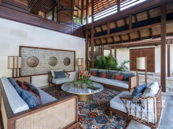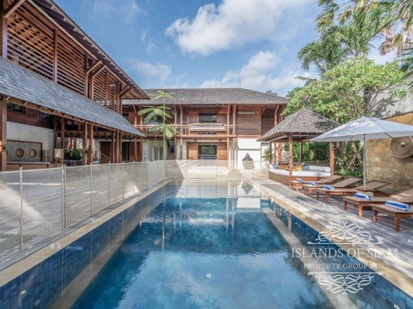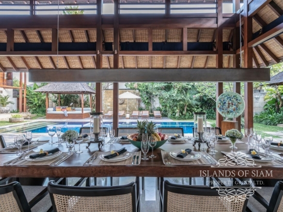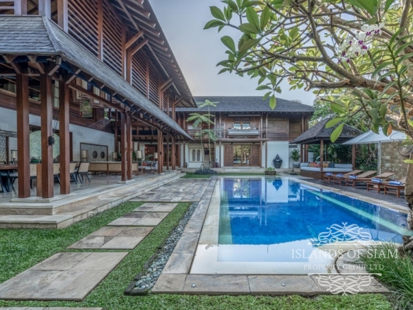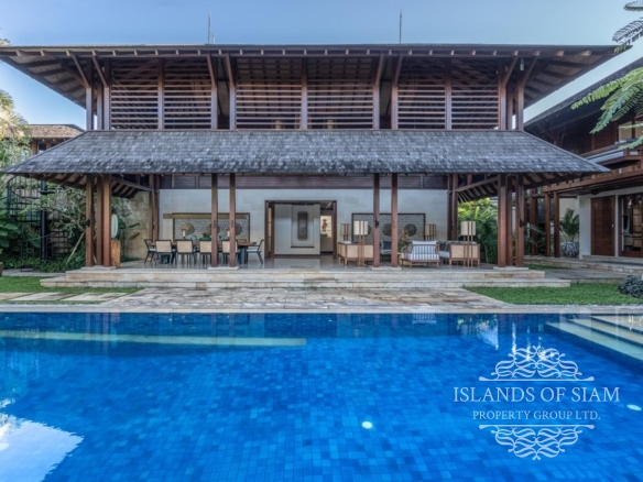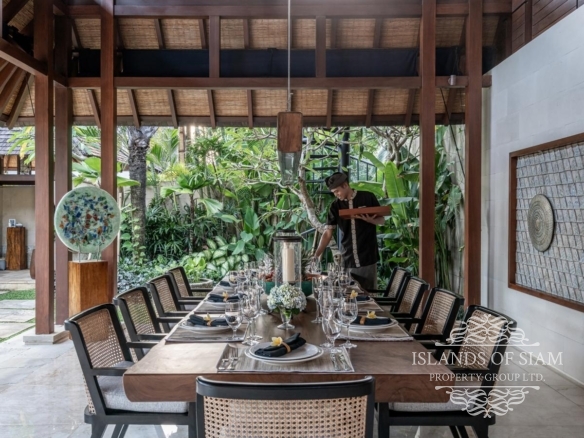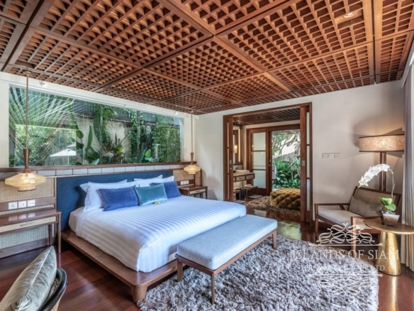 The focus of this handsome tropical home is the 14-metre pool – framed by a pair of two-storey pavilions arranged in an L shape, with a third side taken up by the sun -deck and relaxing poolside balé. But the hub is the open-plan living room – a huge fan-cooled space leading directly to the pool terrace, where guests can settle into comfortable sofas set around a marble table or congregate at the enormous teakwood dining table that seats 12. Behind (but out of sight), you will find the gleaming, modern kitchen where the villa chef concocts mouthwatering meals and snacks, served by the butlers who between them provide attentive 24-hour service.