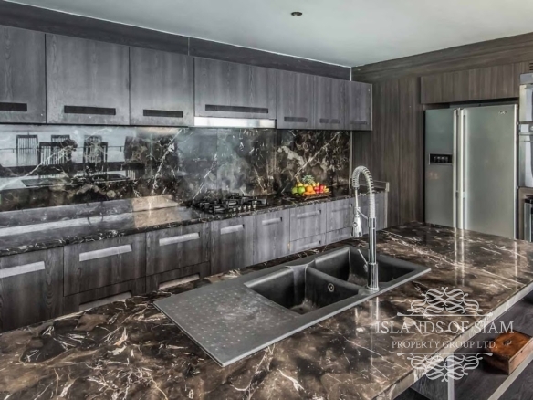 Guests can also watch their meals being prepared and cooked next to them as the chef’s work station is clearly visible. The kitchen is equipped with a granite countertop, double sink, oven, microwave, six-burner stainless steel gas stove and a separate cooking island. The extra space in the kitchen allows guests interested in Thai cuisine to watch the chef and even try their hand at cooking an authentic meal.